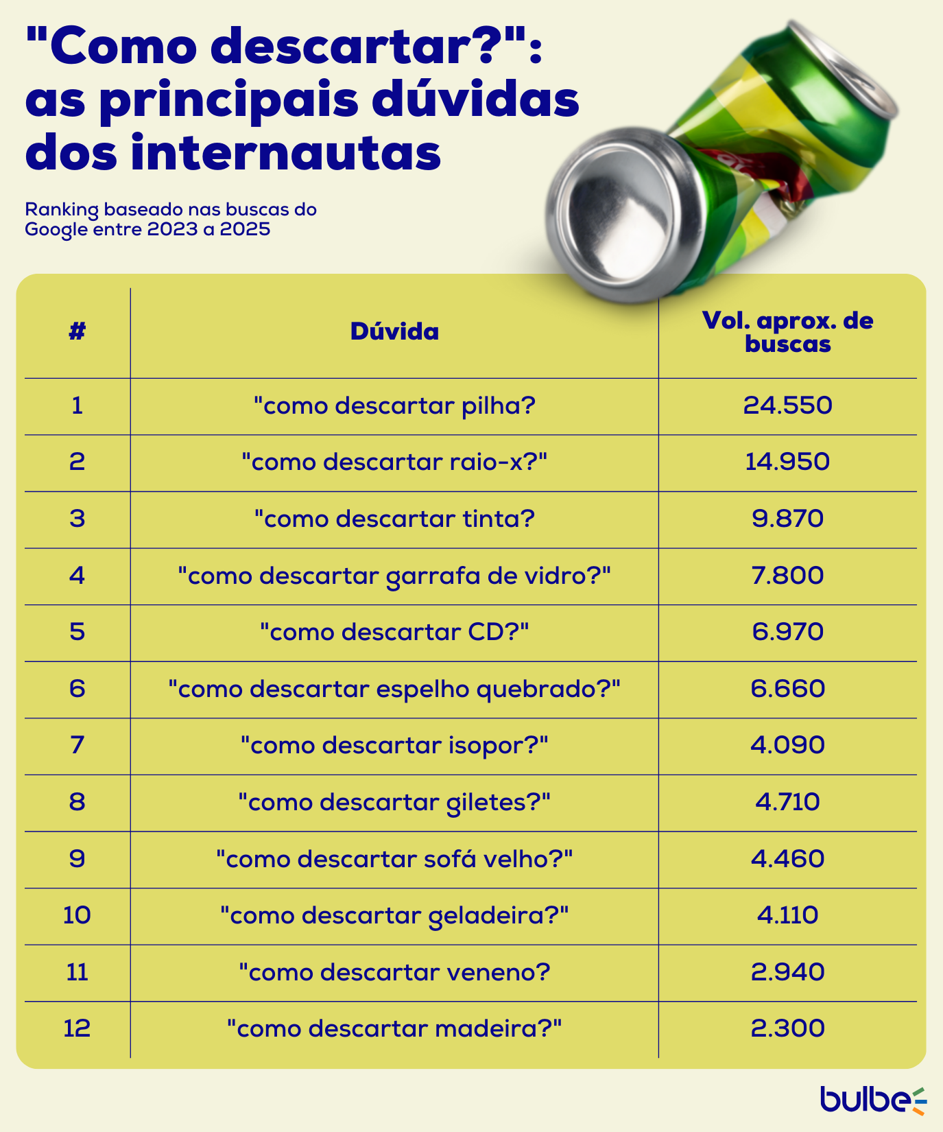 Para descobrir as dúvidas sobre o descarte de resíduos mais pesquisadas no Brasil, foram levantadas buscas para o termo “como descartar”, “descarte de” e suas variações entre março de 2023 e março de 2025. A partir dessas expressões, foi possível compreender o volume de buscas e criar o ranking de itens descartáveis mais procurados para o descarte correto.